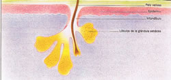 Las glándulas sebáceas son glándulas de secreción exocrina que se encuentran localizadas en la dermis y desembocan por medio de un conducto excretor a nivel de folículo piloso, formando la llamada unidad pilosebácea. La glándula consiste en uno o varios lóbulos cada uno de los cuales tiene un dueto formado por epitelio escamoso queratinizante. Todos estos duetos convergen en el dueto sebáceo principal que se abre al canal pilar y cuyo epitelio está en continuidad con la epidermis de su superficie.